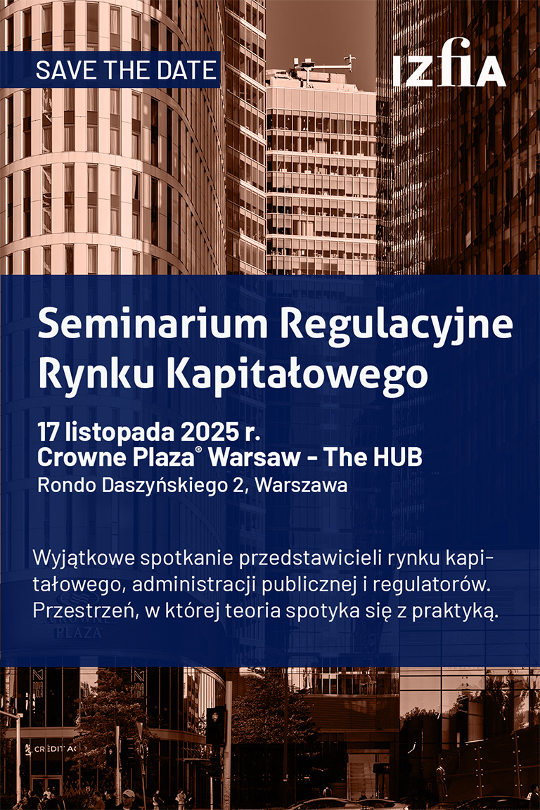 Prosimy o wpisanie do kalendarza daty kolejnej konferencji IZFiA: 17 listopada br. Seminarium Regulacyjne Rynku Kapitałowego to wyjątkowe spotkanie przedstawicieli rynku kapitałowego, administracji publicznej i regulatorów. Wystąpi 40 prelegentów, moderatorów i uczestników dyskusji panelowych. Konferencja ta jest odpowiedzią na potrzebę pogłębionej dyskusji nad najbardziej aktualnymi wyzwaniami, przed jakimi stoi rynek funduszy inwestycyjnych w Polsce i w Europie. Zagadnienia takie jak zmieniające się regulacje, digitalizacja procesów, podatki, nowe klasy aktywów czy długoterminowe programy oszczędnościowe wymagają otwartej debaty, która pozwoli wypracować konstruktywne rozwiązania korzystne zarówno dla uczestników rynku, jak i dla jego instytucji. Potrzeba podjęcia tej rozmowy została wyraźnie zasygnalizowana już podczas Forum Funduszy w Nałęczowie, a warszawskie Seminarium jest naturalną kontynuacją tamtych wniosków i oczekiwań środowiska.